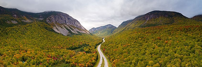 Roads through the mountains reveal breathtaking scenery. US Route 3 and Interstate 93 run north-south through Franconia Notch. Route 16 cuts through Pinkham Notch, and the Kancamagus Highway traverses Kancamagus Pass. Route 302 winds through Crawford Notch.