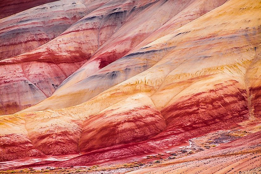 The Painted Hills’ colors are not random. They are the result of minerals interacting with volcanic ash over millions of years. Red layers, rich in iron and aluminum, formed during wetter periods when floodplains carried iron-laden sediments. Yellow layers, derived from iron and magnesium oxides, represent cooler, drier periods. Black soils are lignite, remnants of ancient vegetation, while grey tones reflect mudstone, siltstone, and shale. Dark streaks come from manganese oxide.