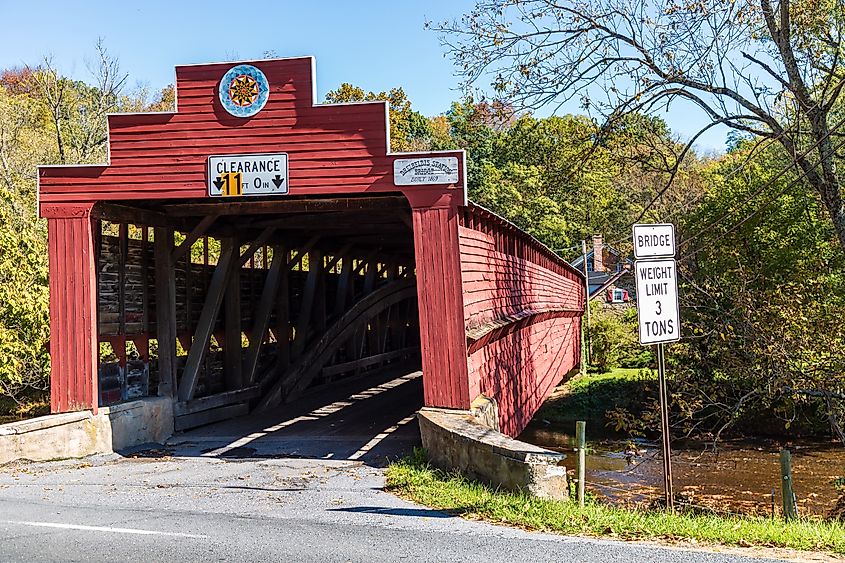 Wertz’s Covered Bridge crosses Tulpehocken Creek in Berks County and stretches 204 feet, making it one of Pennsylvania’s longest covered bridges. Built in 1843, it uses a Burr arch truss, which combines a large arch with supporting beams to carry vehicles safely. The bridge’s wooden roof and vertical siding protect it from rain, snow, and ice, helping it withstand floods and harsh seasonal weather. Over the years, the structure has undergone restorations to replace worn planks, reinforce supports, and maintain safe passage for traffic. Wertz’s Covered Bridge was added to the National Register of Historic Places in 1980, recognizing its historical significance and role in Pennsylvania’s covered bridge heritage.