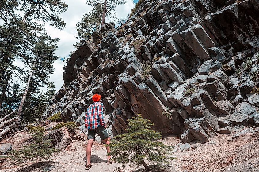 Devil’s Postpile National Monument near Mammoth Lakes, California, presents a striking example of columnar basalt formation. Vertical columns, typically six-sided, rise uniformly from the ground, creating a structure that looks as though carved by a giant sculptor. These formations result from rapid cooling of lava flows, which causes contraction and fracturing into hexagonal patterns.