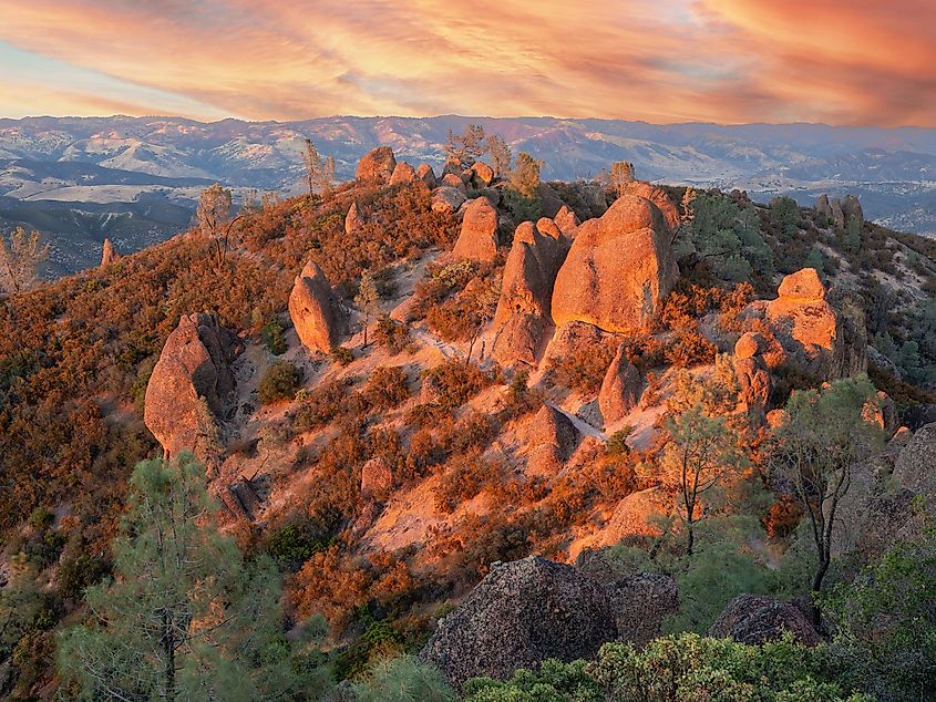 Located in central California, The Pinnacles are remnants of an ancient volcanic field. These spires of volcanic rock rise dramatically from the surrounding landscape, formed over 23 million years ago during the Neogene period. Lava flows were fragmented and eroded over time, leaving behind towering monoliths and intricate rock walls that resemble a cathedral of stone.