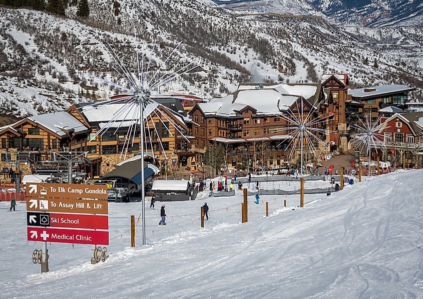 Aspen stands out as one of America’s most iconic ski towns. The surrounding Elk Mountains rise sharply above Victorian storefronts and upscale boutiques that line the downtown. A walk through town passes art galleries, fireside lounges, and historic landmarks that date back to Colorado’s silver boom.