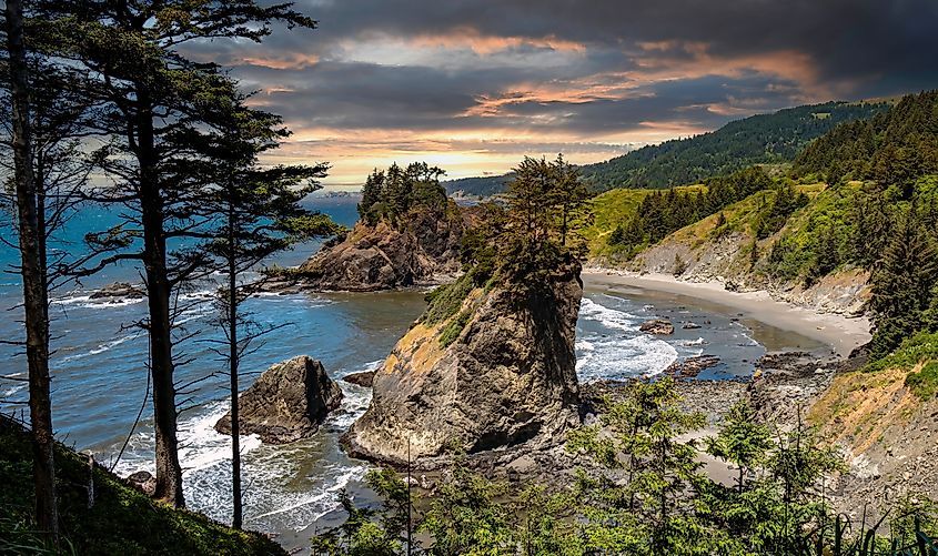 Along the Pacific, 363 miles of coastline remain open to all by law. Cannon Beach and Cape Kiwanda showcase dramatic sea stacks, shifting dunes, and the ceaseless rhythm of the waves. Inland, the Cascade Range rises into snow-covered peaks such as Mount Hood and Crater Lake, the nation’s deepest lake, born from an ancient volcanic collapse.