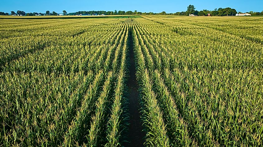 Corn is one of Ohio’s top crops and fuels both livestock feed and ethanol production. The state shows how the Corn Belt blends into other farming regions, with production tapering off instead of stopping suddenly.