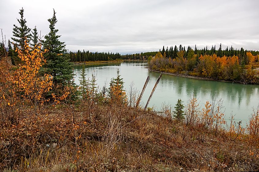 The water itself carries fine silt and suspended sediment that give it a pale, milky hue. Its turbidity is higher than that of Siberia’s major Arctic rivers, a sign of the glacial melt and erosion that continually reshape the landscape. Despite its turbidity, the Yukon’s water quality remains relatively healthy. Monitoring by the U.S. Geological Survey shows stable oxygen levels and minimal heavy metal contamination.