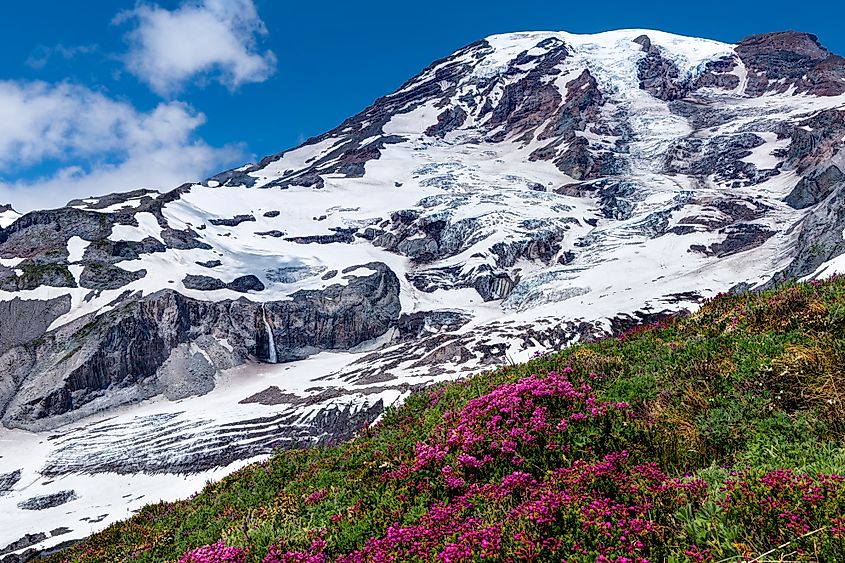 In 1899, Mount Rainier became the fifth national park in the United States, preserving 369 square miles of wilderness. At the heart of the park is the volcano itself, but the surrounding area is just as diverse and spectacular. From ancient coniferous forests to alpine meadows and tumbling waterfalls, the terrain changes drastically with elevation.